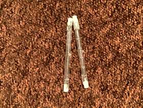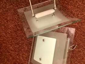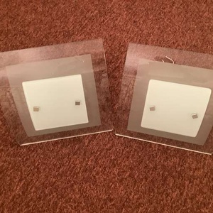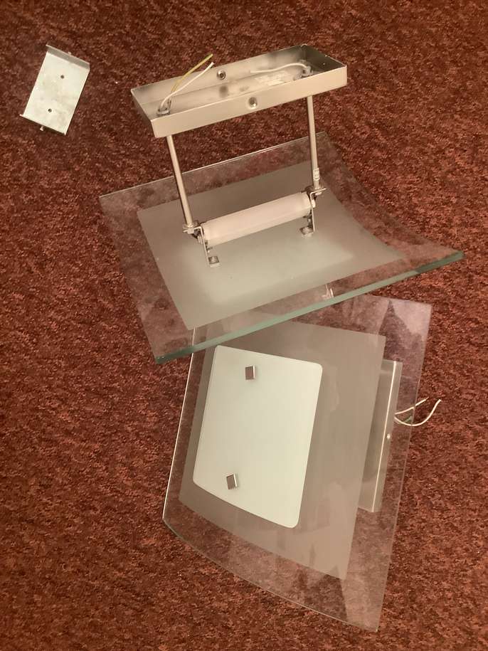 Identical ceiling lights. Glass and chrome. Excellent where bright light is required. Each light takes a 300/500 watt tungsten strip element (supplied). Complete with ceiling fittings.