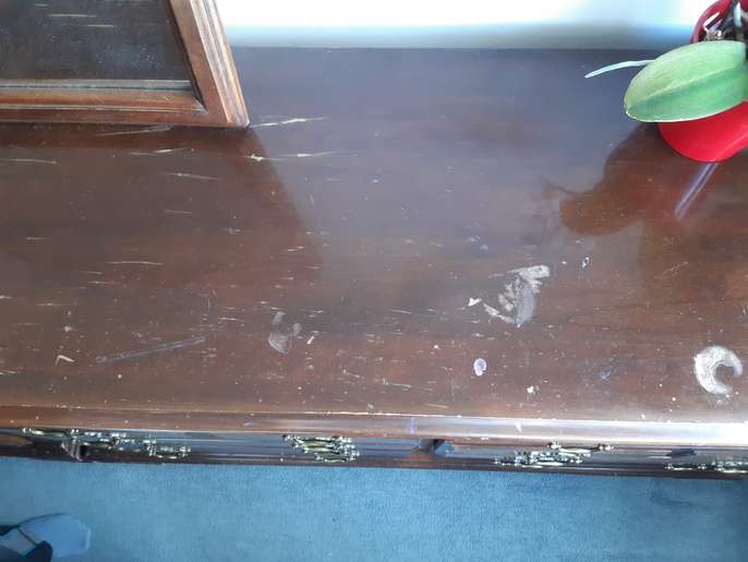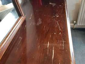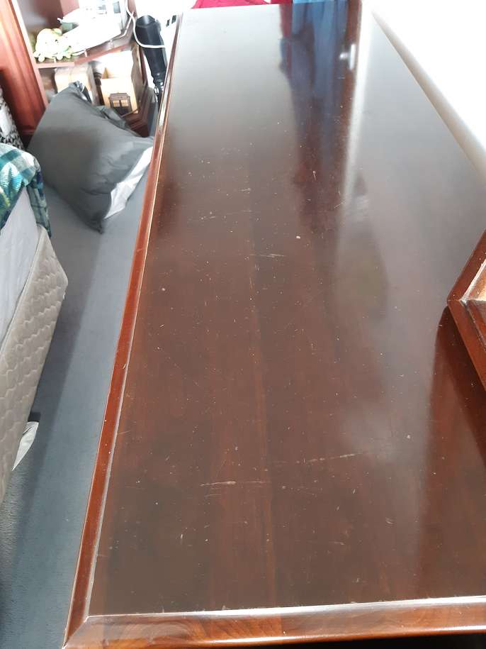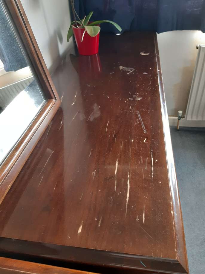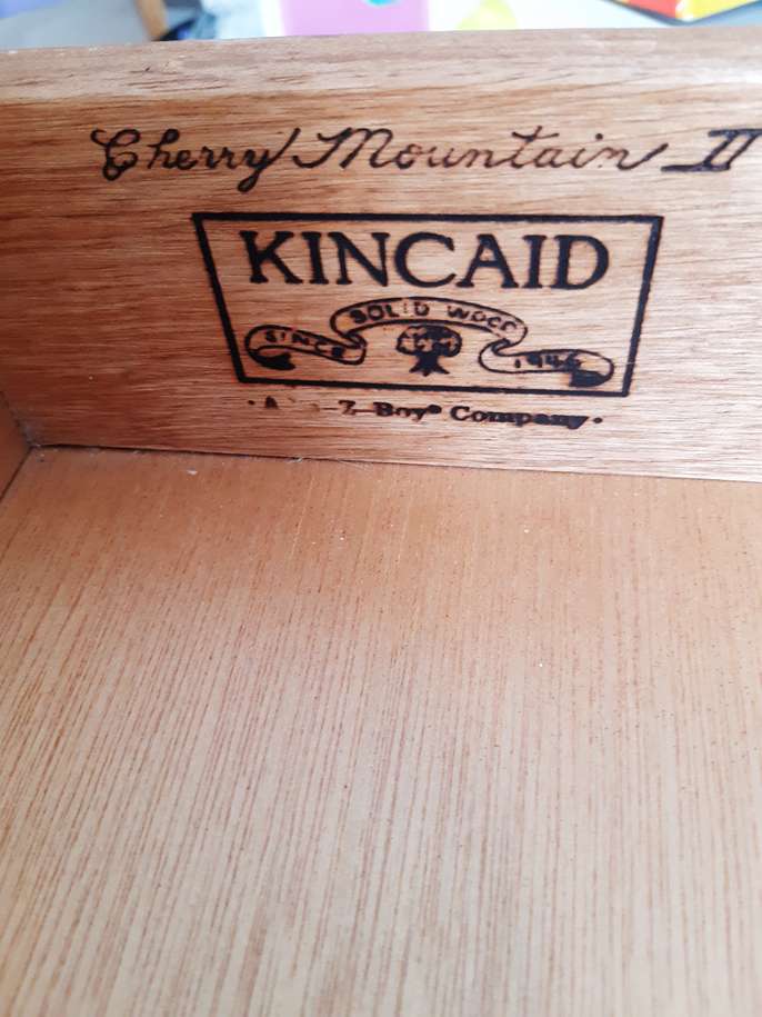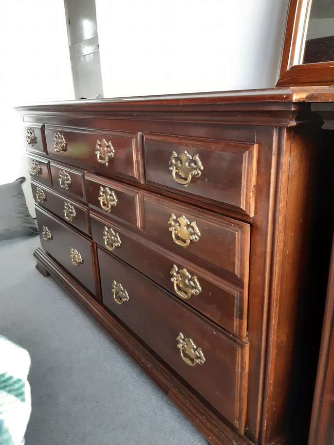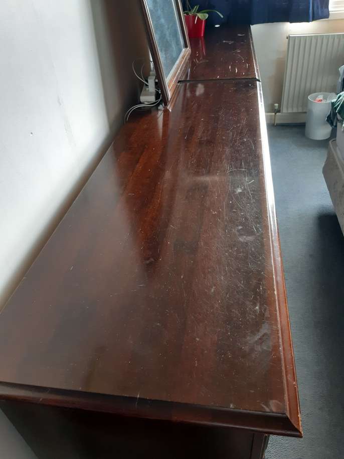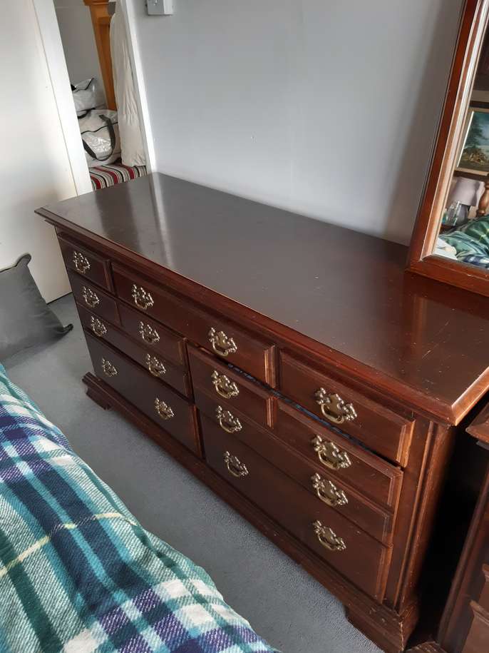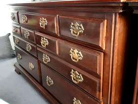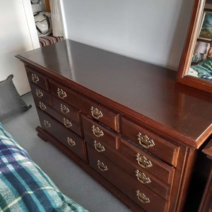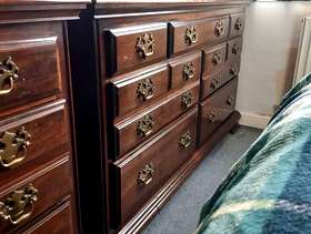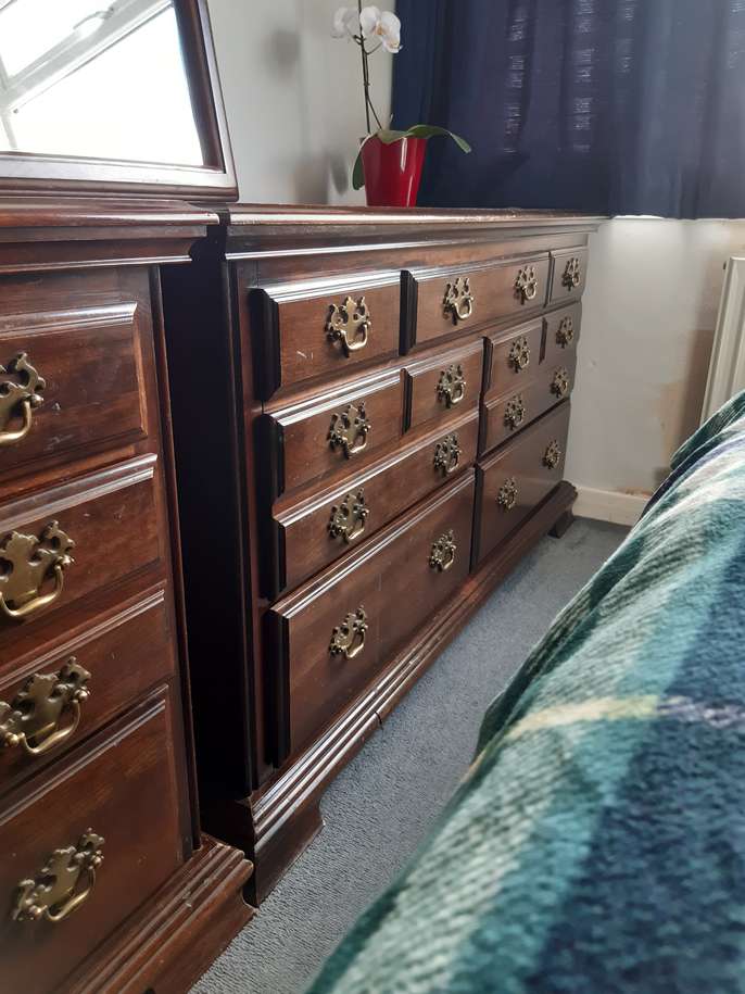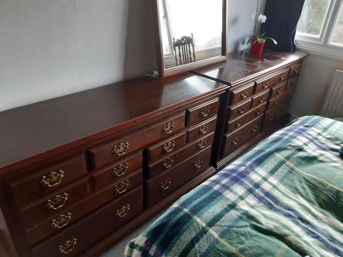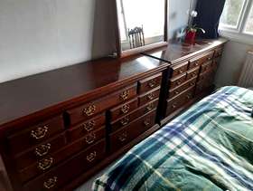 Two large solid cherrywood chest of drawers manufactured by Kincaid Furniture Co (a well known American brand). 144cm x 48cm x 80cm One set in good condition, second set has some damage to the top surface and needs rubbing down and revarnishing. This is solid wood furniture not veneer so sanding down and revarnishing is perfectly possible. Each has 6 drawers 1- 60x34x17cm usable 2 & 3- 25x34x17 usable 4, 5, 6 & 7 - 60x34x18 usable AVAILABLE END OF MAY (when our new bedroom is fitted) (We also have 1 small chest of drawers available, see separate listing - available immediately)