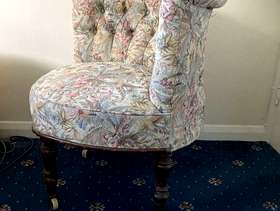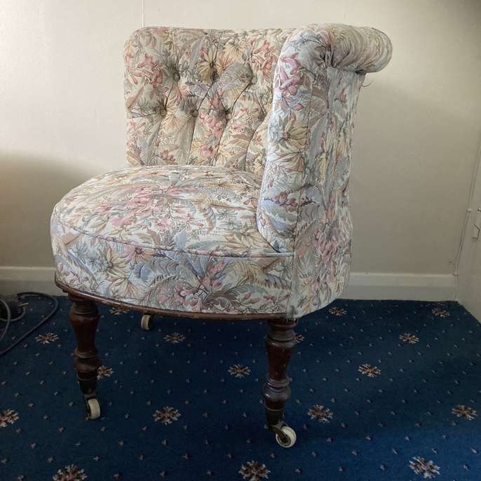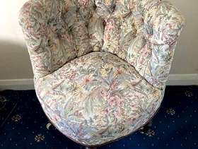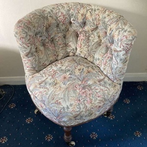 Semi circular chair with low back, upholstered in good quality tapestry fabric with button back. Width 26 inches, Depth 28 inches.