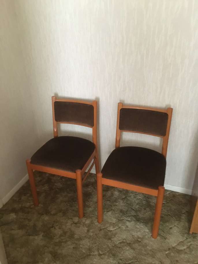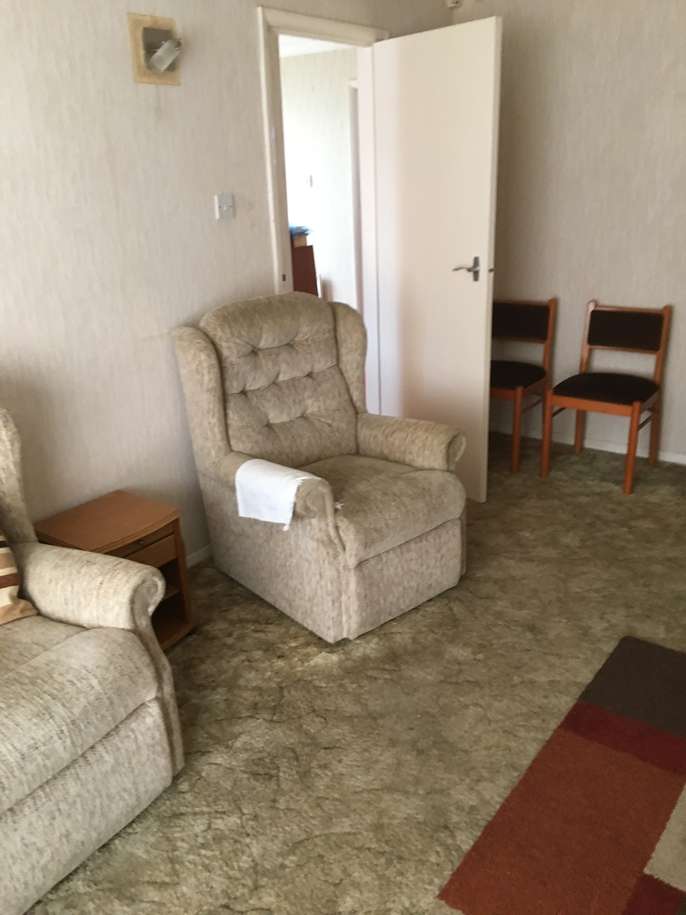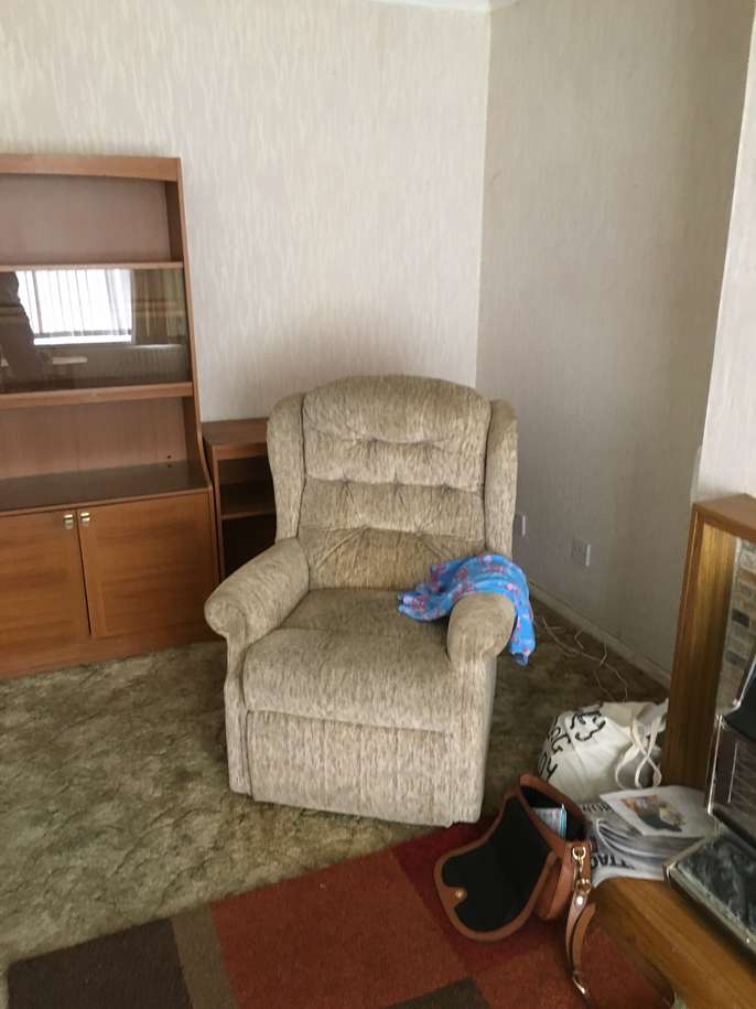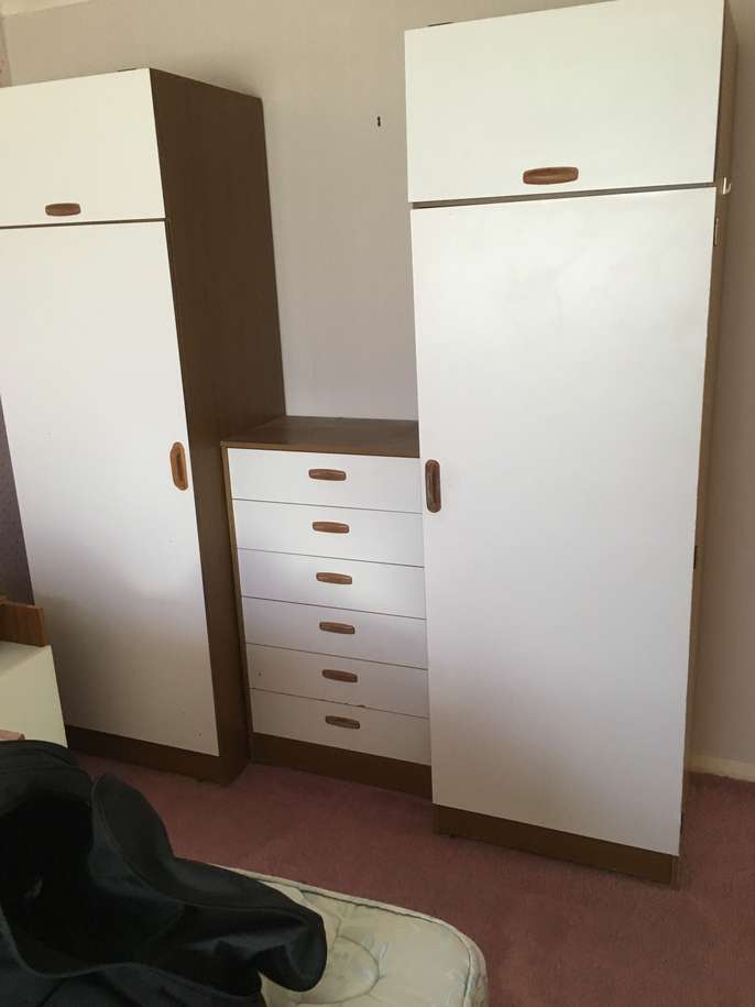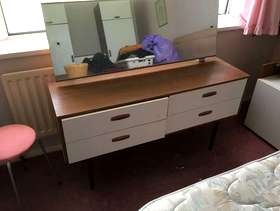 Three piece suite, sideboard and storage unit/ bookcase, dining chairs, cooker electric oven/ gas job. Cane chair, dressing table and wardrobe. Bed side cabinets. Double bed and bureau.