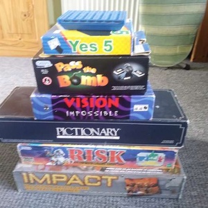 Various games, all complete and in good condition: Risk, Impact, Pictionary, Vision Impossible, Pass the Bomb, Yes 5 & a mini connect 4