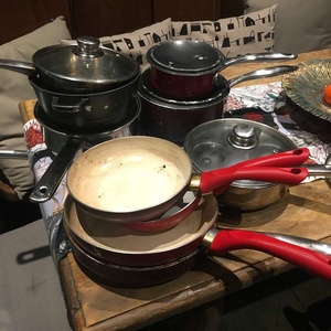All well used but clean and useable. Set of frying pans, a number of pots and a pouching pan.