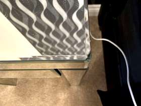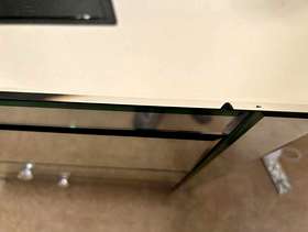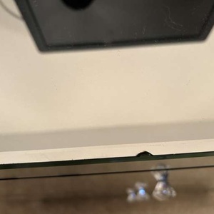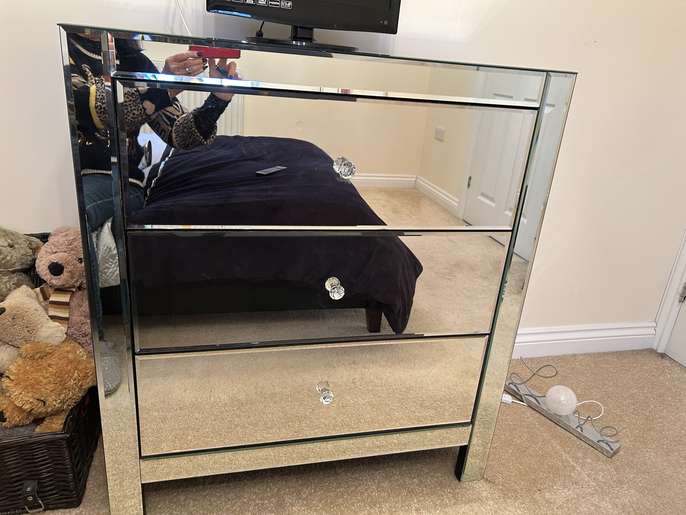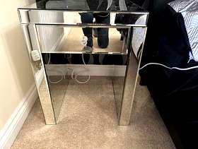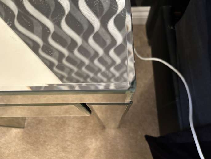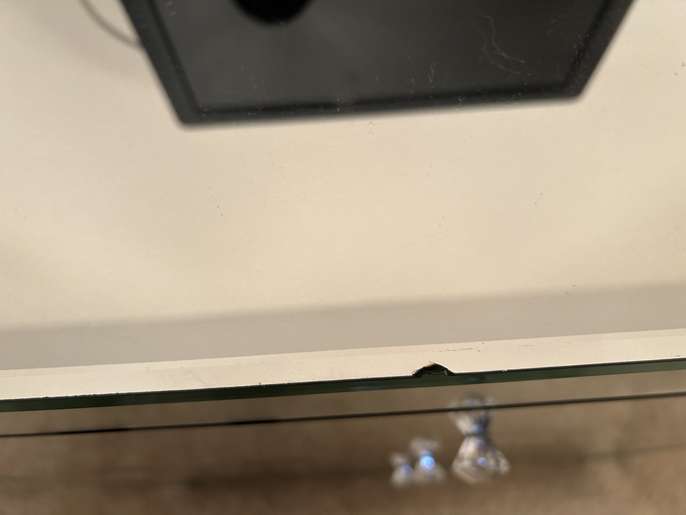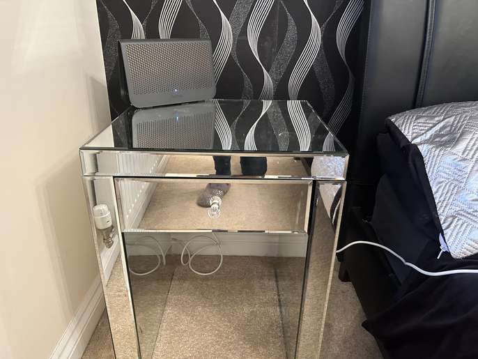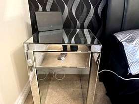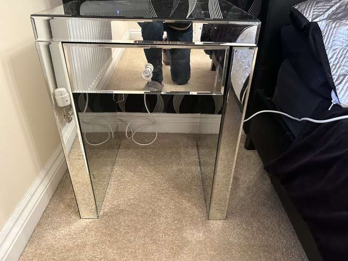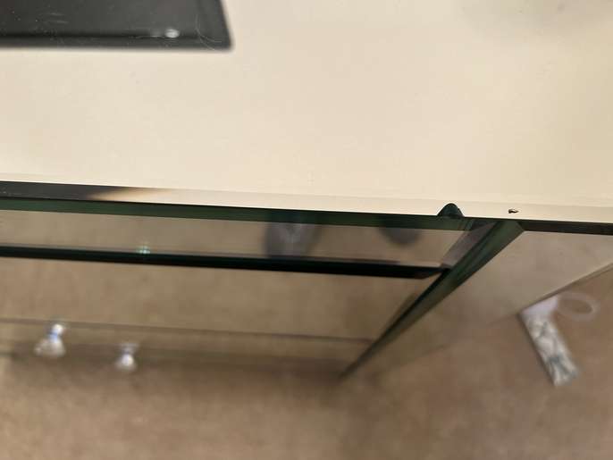 The chest of drawers is made of Venetian glass. It does have a couple of small chips, but there is plenty of use left in it. The bedside table has a tiny chip in one corner.