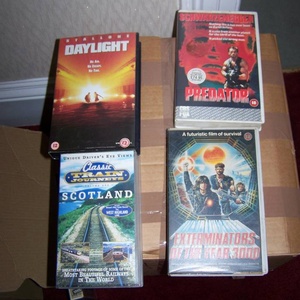 Approximately 100 vhs tapes all in original cases packed in 3 cardboard boxes.Space needed so collect as soon as possible. Far too many to list but such as Daylight,Highlander,Titanic,and many many more.