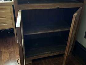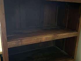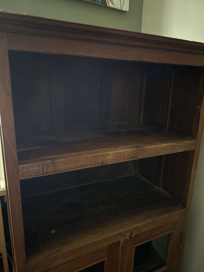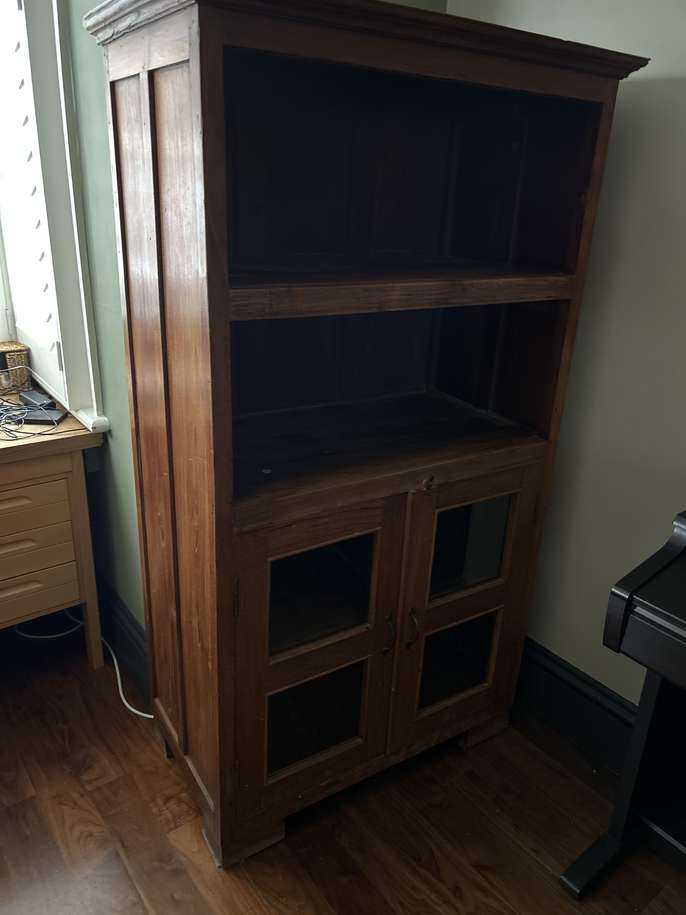 Solid wood tall bookcase with shelf and cupboard with glass doors below. Very sturdy. Some wear on shelves that can be sanded stained/ painted. Dimensions. 160cm H; 90cm W; 49cm D. Interior shelves: 81cm W x 45 D
