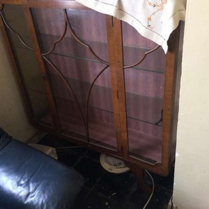 Nice piece of furniture. all the glass is intact. measures approx, 42 inches across, 45 inches high and 12 inches deep.
