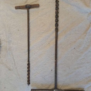 Two large augers, about 2feet long. One for 1 inch diameter holes and one for 7/8 inch. Both good useable or decorative.