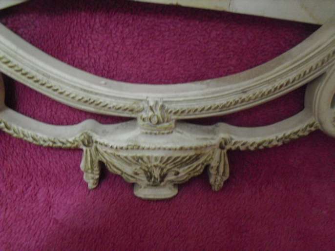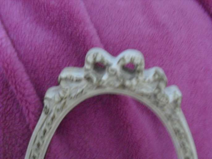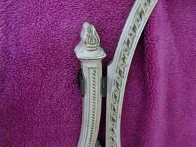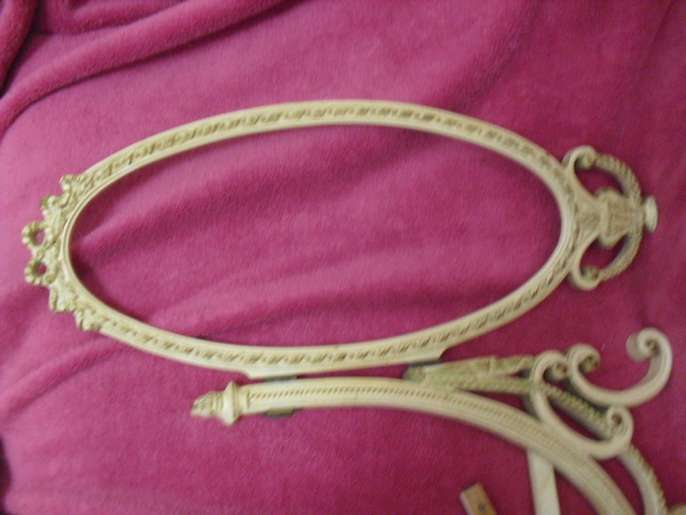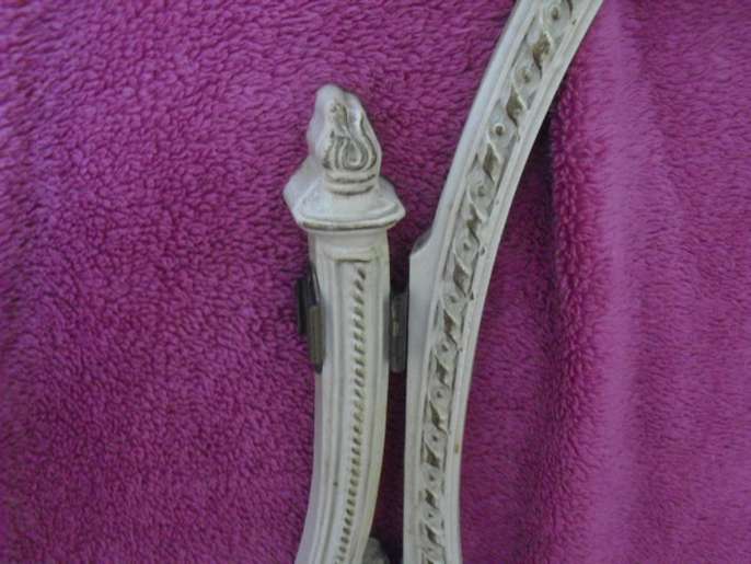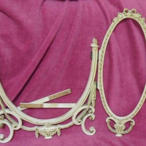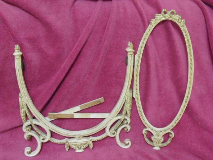A "shabby chic" mirror stand, cream with gilt highlights. No mirrors. Grubby but should clean up lovely. Height of stand: 58cm Width of main section: 44cm Width of "wing" section 22.5cm Collection evenings and Sundays only.