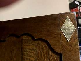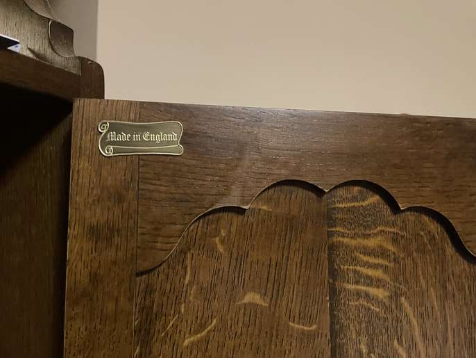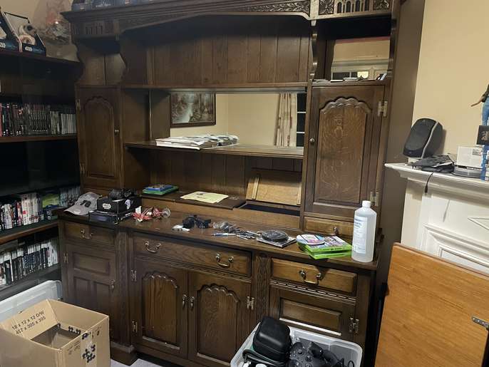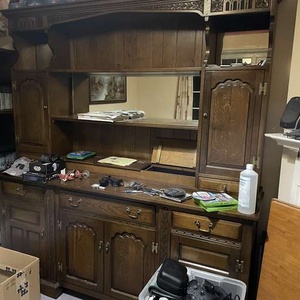 This unit is by Old Charm and is in good order. The dimensions are 192cm wide, 44cm deep at the deepest point and 2000cm tall. It’s a BIG unit. The unit has three large cupboards and two smaller ones. There are five drawers plus three compartments with lifting lids. In addition, two display shelves with glass backs and three shelves. Lots of display room at the top. You will need to remove this from the room and transport it. I cannot help with this. The top can be removed from the base.