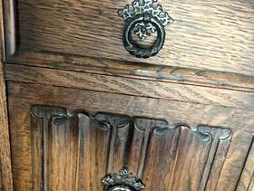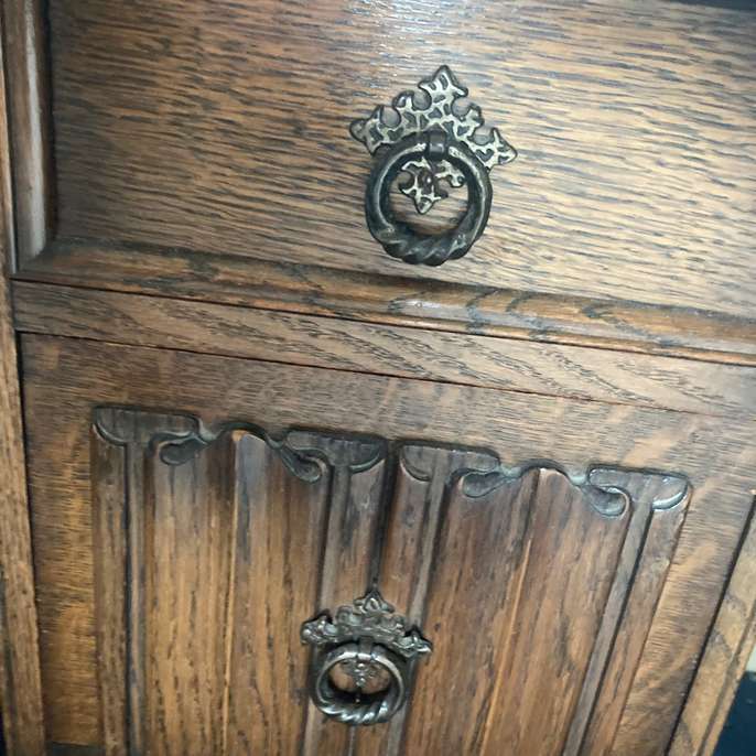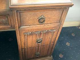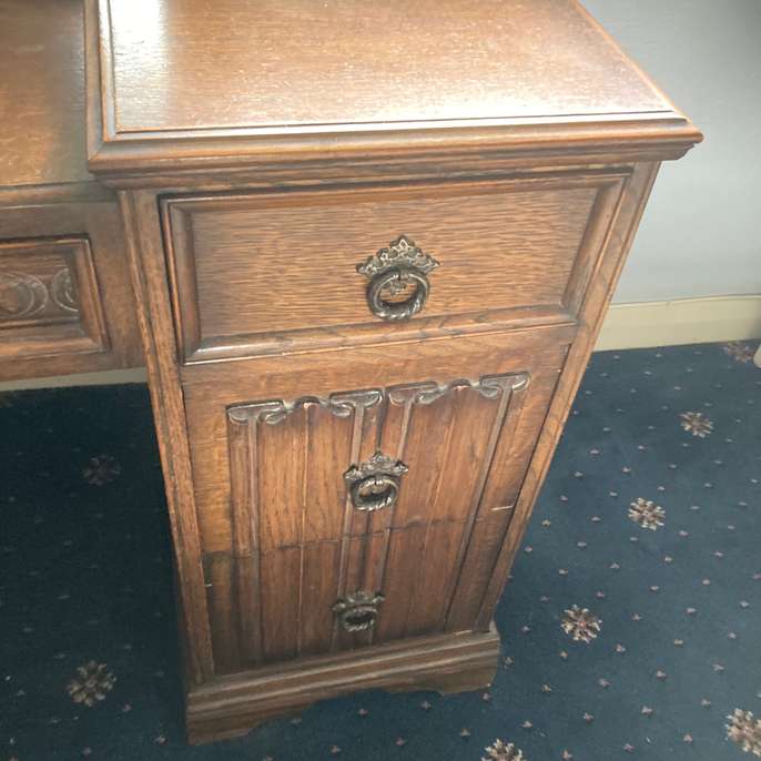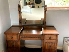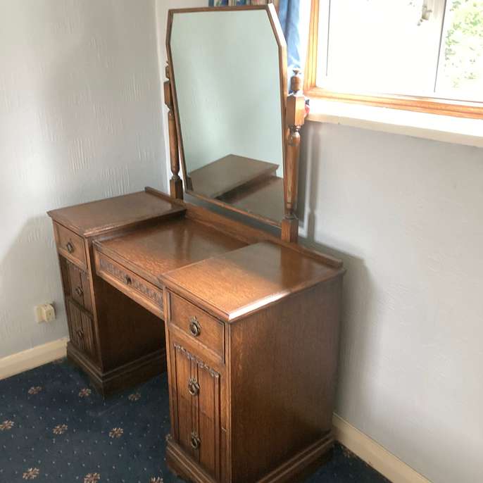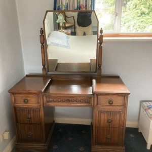 Vintage walnut dressing table fro, 1950s. Central hinged mirror which can be removed. Three drawers on either side and one in the middle.