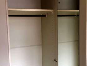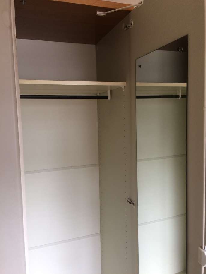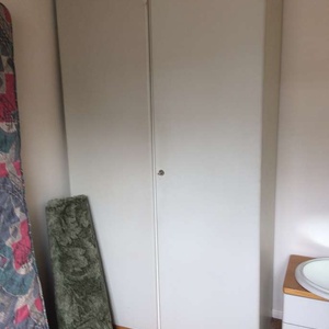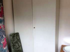 Double wardrobe, with key, white with pine trim, and full length mirror on inside door. Good condition just needs to be cleaned. Bedroom draws and vanity unit also available to match ( slightly dated in style)