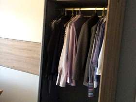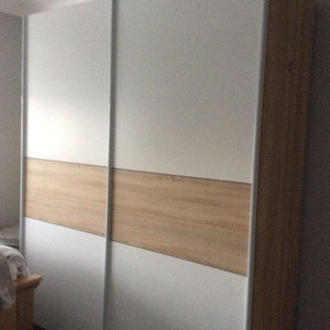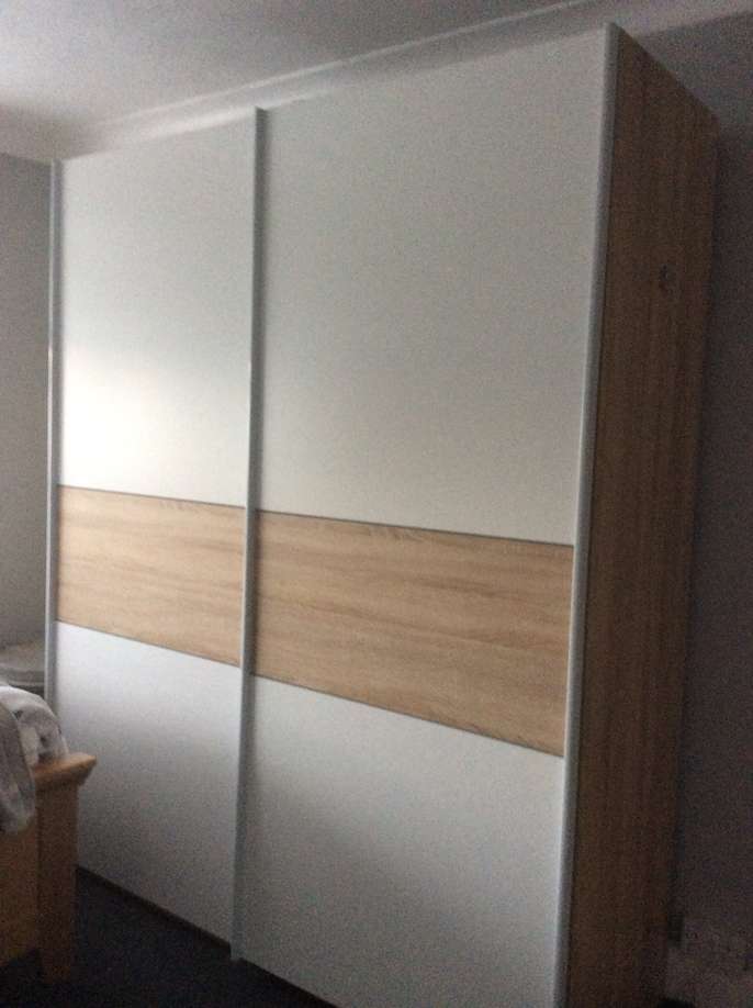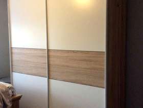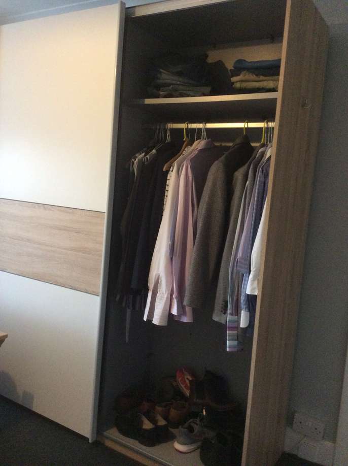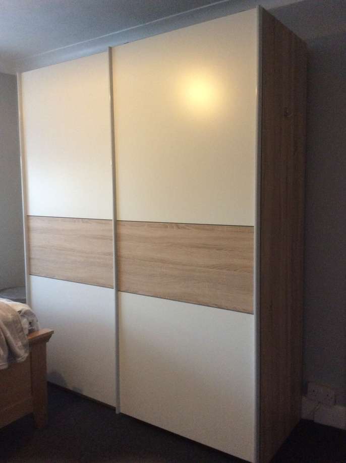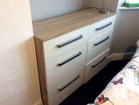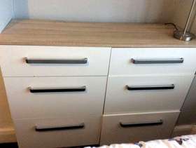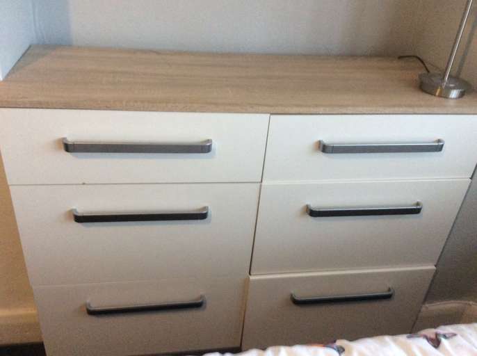Large double wardrobe with sliding doors, plenty of hanging space and a top shelf on each side. DImensions are inches - width 68, height 82, depth 23. 2 x matching chest of drawers. DImensions in inches are width 47, height 34, depth 16. IMPORTANT INFORMATION. - collector will need to dismantle wardrobe to get down stairs. All very good condition