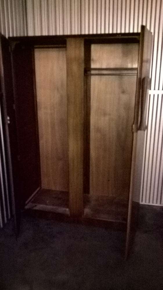Maker Supersuite. Size H 185cm W 120cm D 53cm. Purchased in the late 50's 2 hanging rails and top shelf on right side Small piece of veneer missing above right door, otherwise good condition Located in Highams Park, London E4. You will need a van to collect this due to size Smaller matching wardrobe also available Apologies for poor picture quality - please see the matching wardrobe for a better idea of the colour