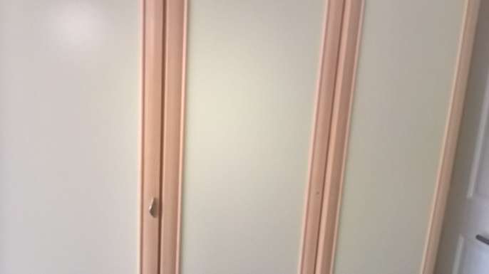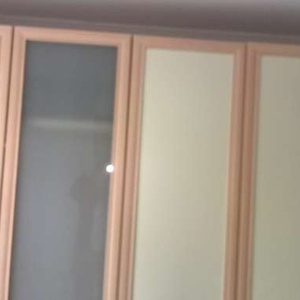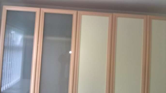 Set of five matching wardrobes, 2 doubles and one single. One set of doubles has opaque glazed doors. These are a large set of wardrobes in good condition. The doubles are 35" x 88" and the single is 17". Whoever takes them would need to dismantle them and they would need a large van to take them away.