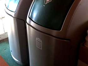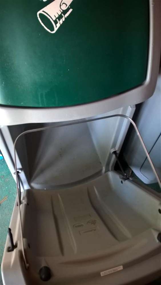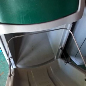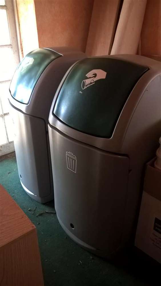 Two very large waste bins suitable for external areas for businesses etc. Bin liner held in place via a steel ring attached to the opening front flap so when flap opened, bin liner pulls forward for easy removal. Front flap held in place by two clips (One on each side). Measure 114 cm x 59 cm x 58 cm (h x w x d). Collect from GL2 7BT Monday to Friday 9-5.
