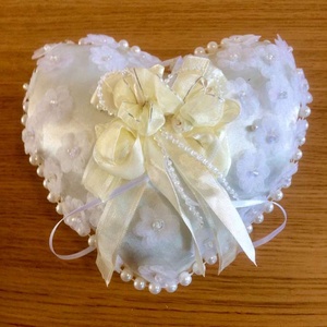 Heart shaped ivory pillow, decorated with ivory coloured beads and white flowers. Material thought to be polyester. Size approx 18cms wide, 15 cms length, and approx 9cms in depth. Collection only.