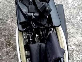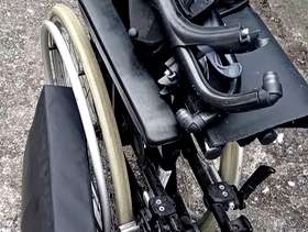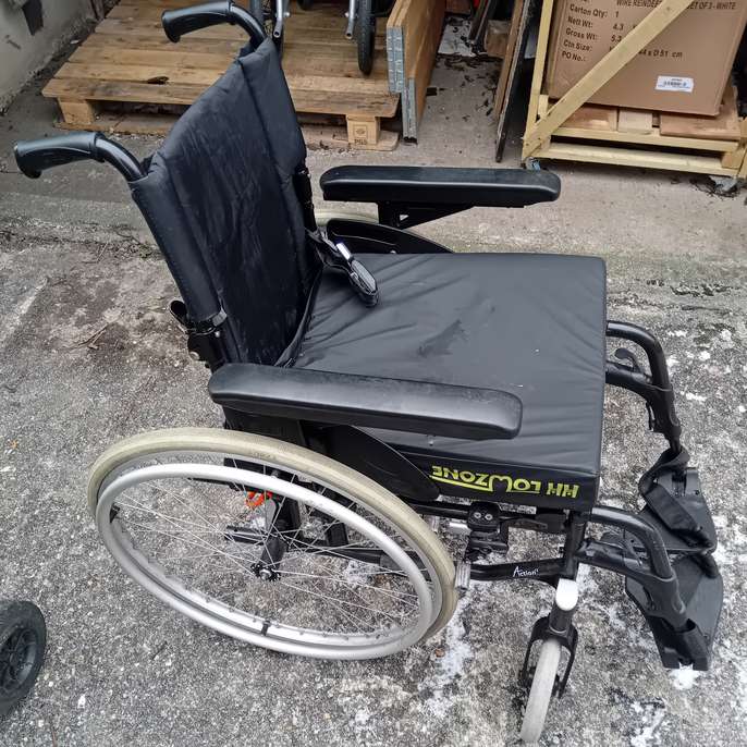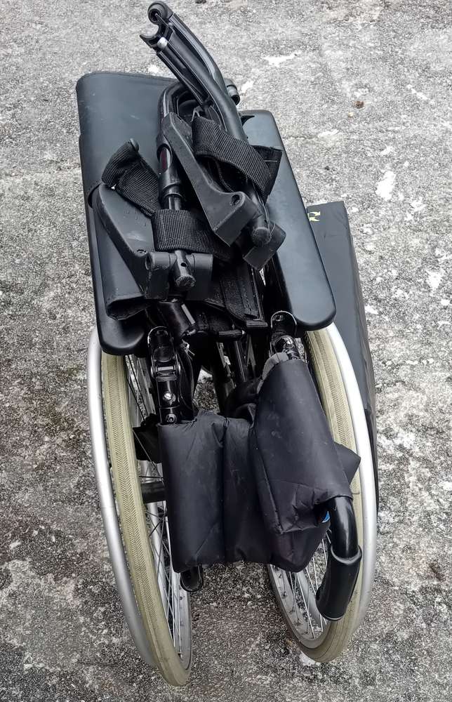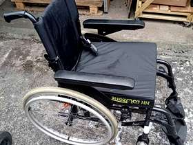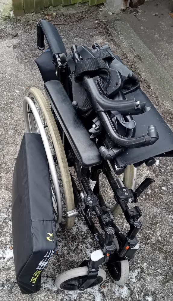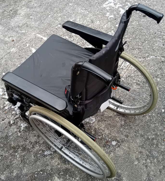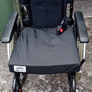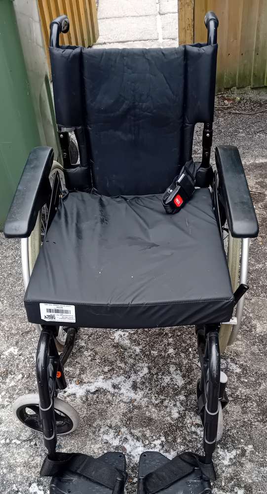 Self propelled adult wheelchair with extra thick wipeable seat cushion and foot rests. Old, looks a bit shabby as its been in my garage for a while but works fine. One brake lever missing its rubber end but working OK. Folds up for easy transport in vehicles. Used for my elderly mother for a few years but she no longer needs the self propelling big wheeled type chair so we now have a lightweight indoor chair instead.