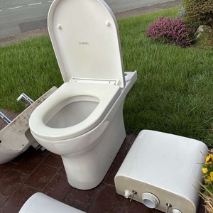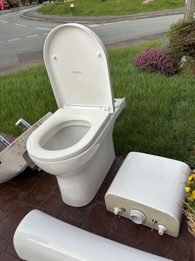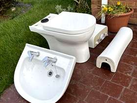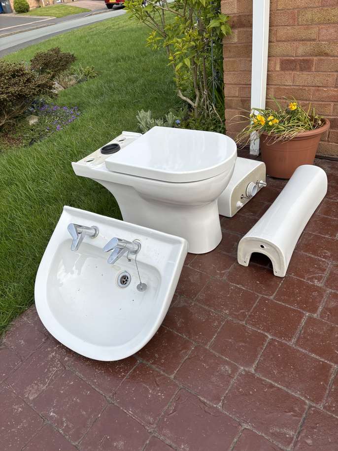 White Toilet & cistern with soft close seat plus pedestal basin. Waste and taps included. Good condition.
