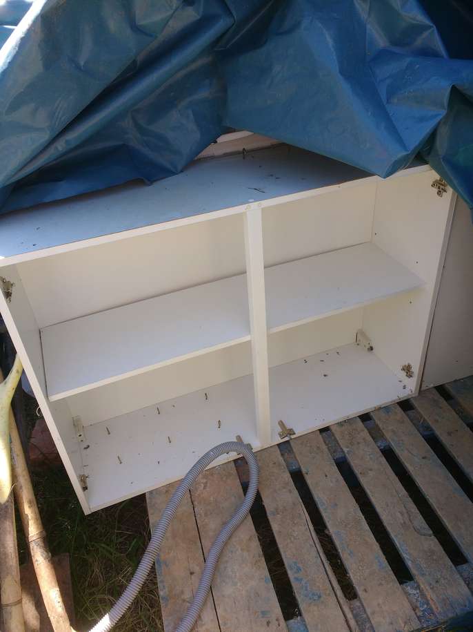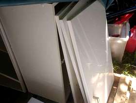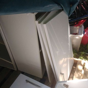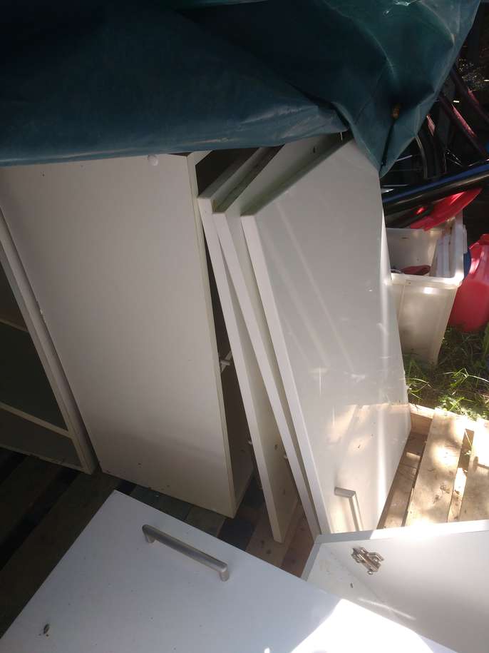 Please text 07512367006 to arrange pick-up. First come first served. Three white kitchen cabinets. Two single, one double. The doors are gloss, handles chrome. Free for collection from SE6. Good condition. I was going to re-use these in my new kitchen but am going for shelves instead. They will need a wipe as we've just put them out in the garden on pallets. Measurements Double: 100w X 31d X 73h Single: 50w X 31d X 73h
