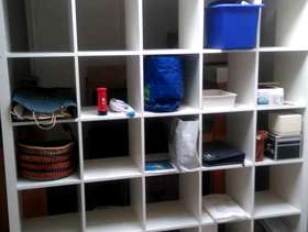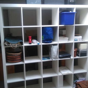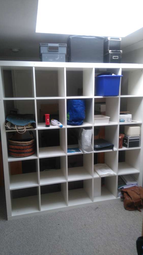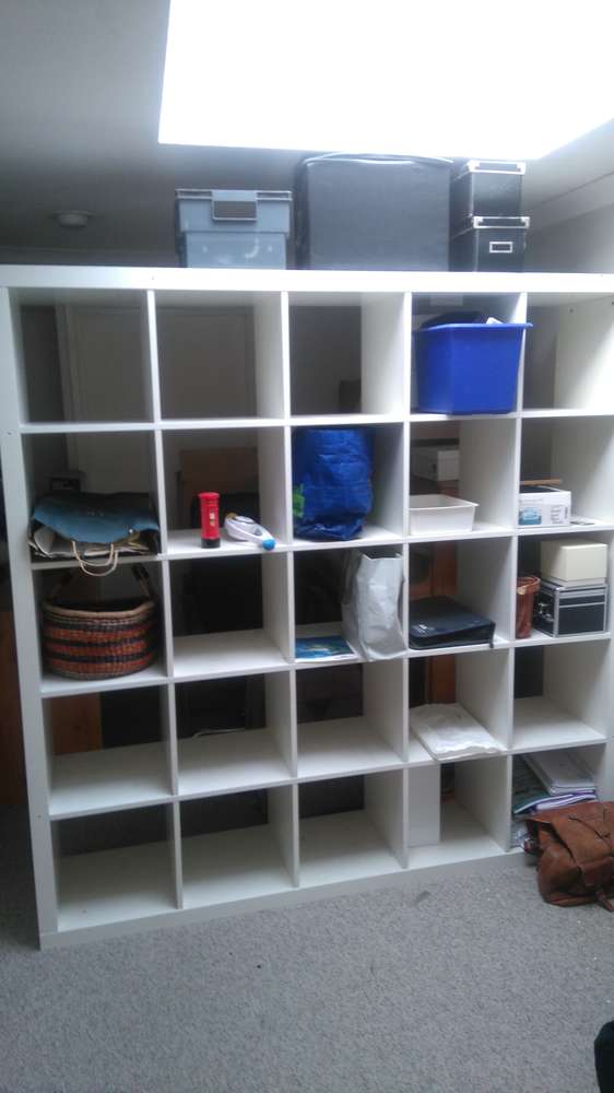 White shelving unit. 6ft long, 6ft wide and 1.5ft deep. Has been used in our study to store toys. See photos attached. Thanks