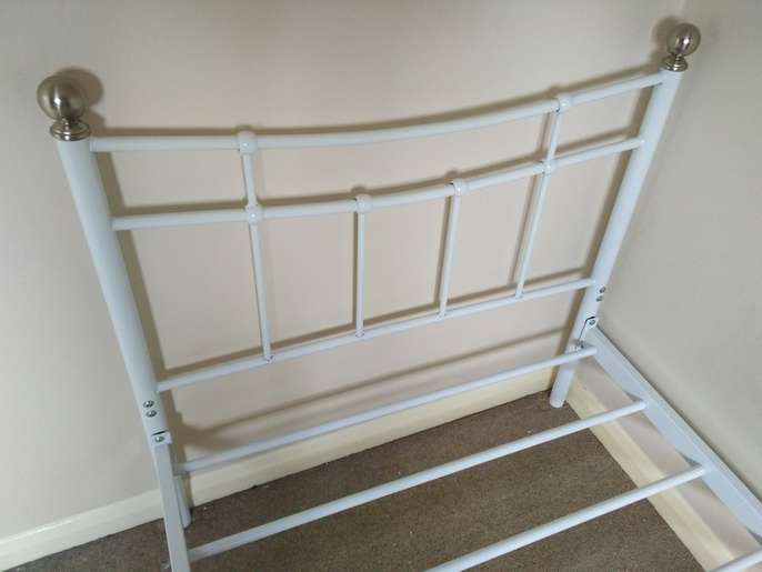 Argos white bed frame. Full size, but ideal as child's bed. Great condition. Bought approximately 5 or 6 years ago. Not sure if they have changed in the past few years, but Argos seems to still be selling the same thing for £99! I think it's the same as: https://www.argos.co.uk/product/6342827 Argos Home Darla Single Bed Frame - White 634/2827 If so, then here are the details: "Part of our Darla collection, this piece will offer timeless appeal to your bedroom. The bed frame has been crafted from metal with an outstanding white finish, bringing a romantic air to your home. Spherical silver finials complete the bedposts with a smooth curvature in the middle of the head and footboard for a more traditional look. •Part of the Darla collection. •Metal frame. •Base with metal slats. •Size W100, L202, H95cm. •24cm clearance between floor and underside of bed. •Weight 16.2kg."