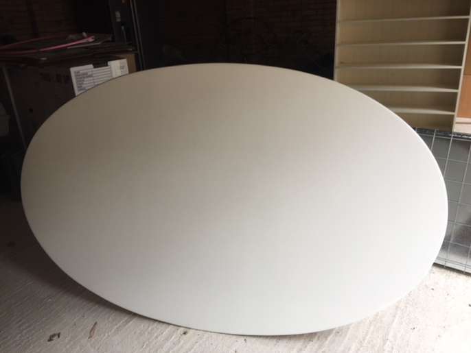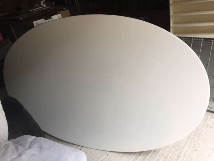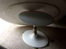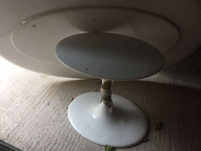 White tulip table with stand. Lost the screws. Very heavy. Measures approximately 48" wide x 78" long. Cost over £1000. Has been used but its in good condition. I have 3 chairs available too.