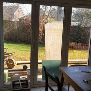 I have a white UPVC door for offer. It measures apps 230x200cm with each panel about 76cm wide. It is in pretty good condition - the double glazing panels are all still in working order and I have the keys. The seal around the edge is a bit loose but I imagine it could be easily replaced if required.