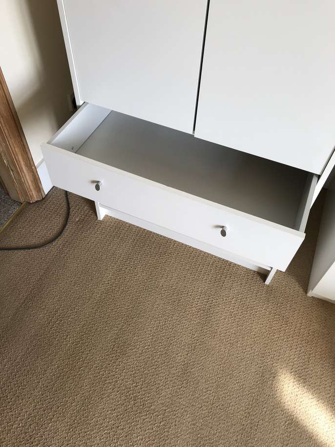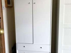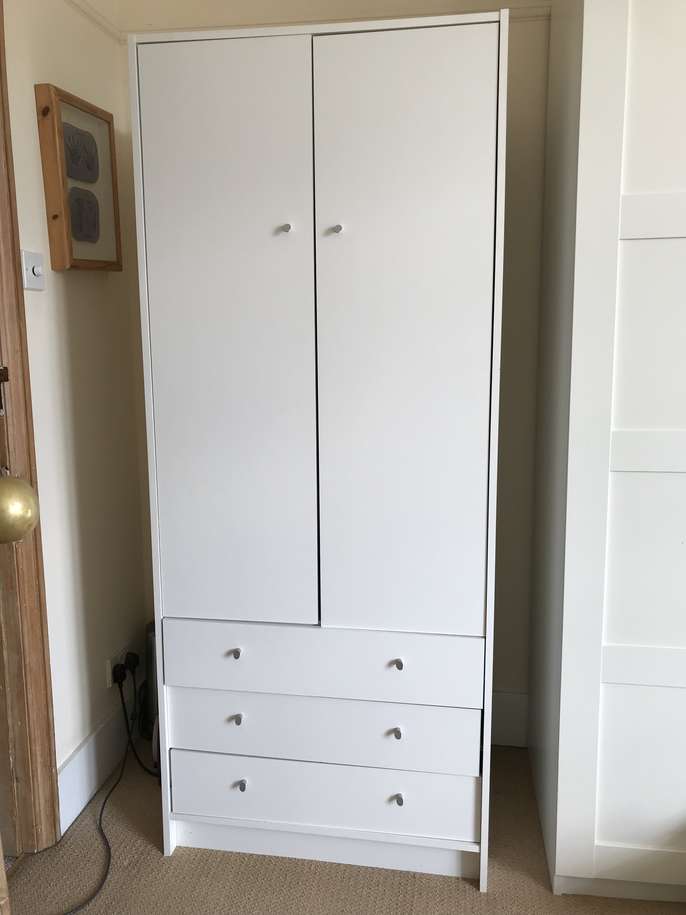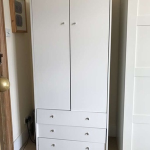 Plain white melamine wardrobe with three drawers, originally from Argos, about 9 months old Small nail coming out side but easily fixed. 180cm H. 74.5W. 49D