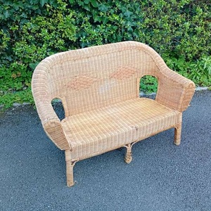 Two seater sofa. In sound clean condition, but the wicker dressings on some of the legs are a bit tatty. It has been a useful decorative item in our bedroom for some years.