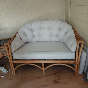 2 seater wicker sofa. Perfect condition with new cushions. Max width 140mm Deepest depth 100mm Frame height 77mm with cushion 80mm