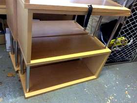 S-shaped free standing shelf units, can be combined / stacked Can be attached to wall for safety Good condition