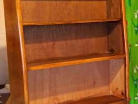 I stack these two, but you can take either. One is a yard wide, nice heavy wood, adjustable shelves, and 44.5" high. And the other is thin, light, 34" high, and slopes, so the top is less deep, (like a display case.) Jump three photos in, because I don't know how to delete, yet!