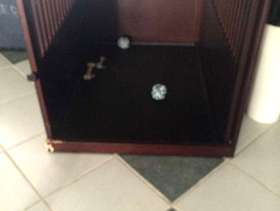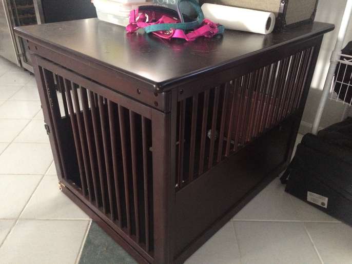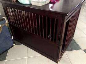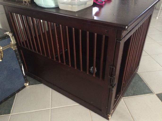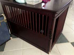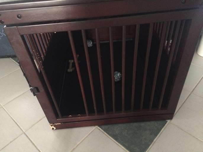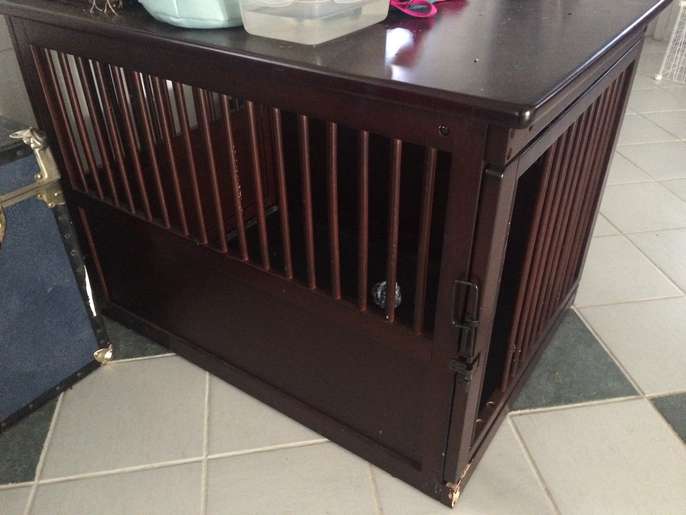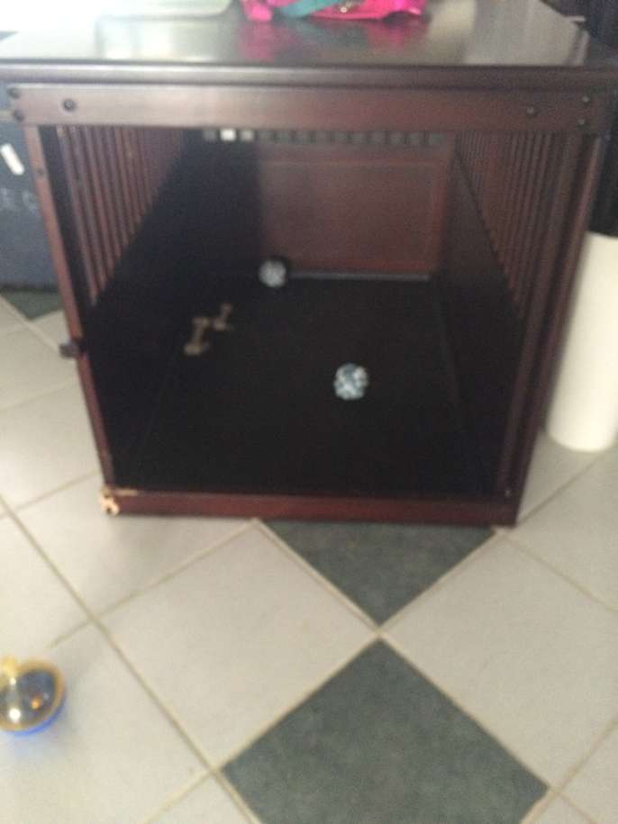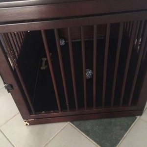 Dog crate that looks like wooden furniture. Ok condition but two of the bars are missing. It can still be used without the front door or you could fix it. My dog has outgrown it. First person to collect can have it.