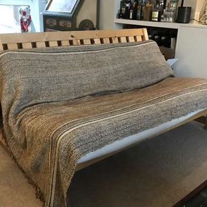 The Futon company wooden double futon bed and mattress. The base is in excellent condition but the mattress is a bit tired looking. Throw not included! Measurements: 136cm wide (142.5 at the hinges) 190cm long 30cm high