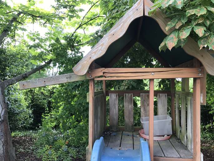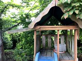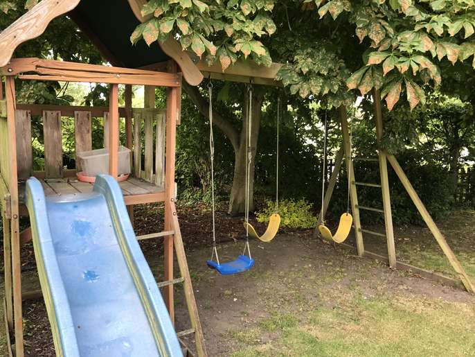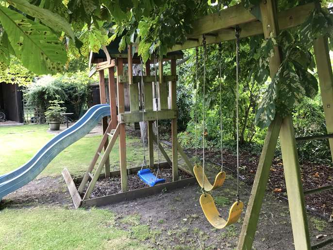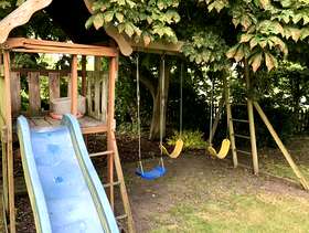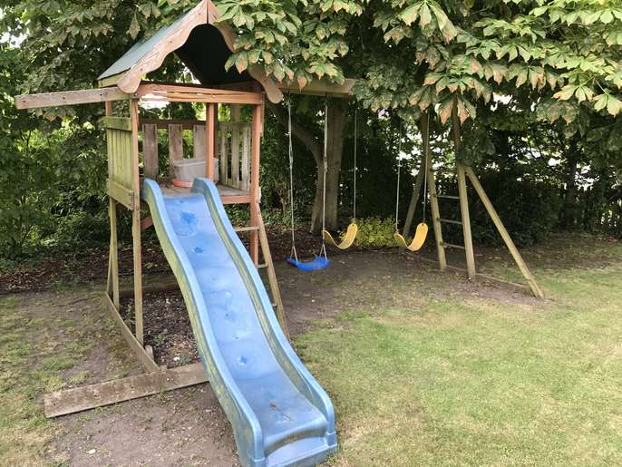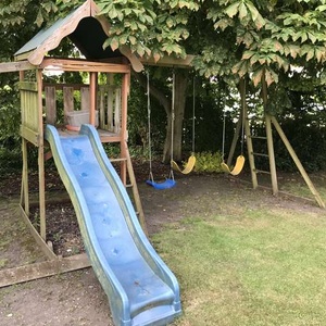I have a wooden three swing and one slide set. There is slight damage to one support and with the slide attachment . Ideal DIY project.